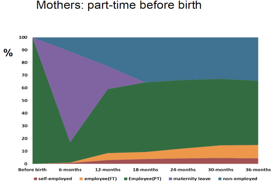 Note: the proportion of males in part-time employment is too small to be reported. Employees and those out of labour force prior to childbirth are included in the table.
