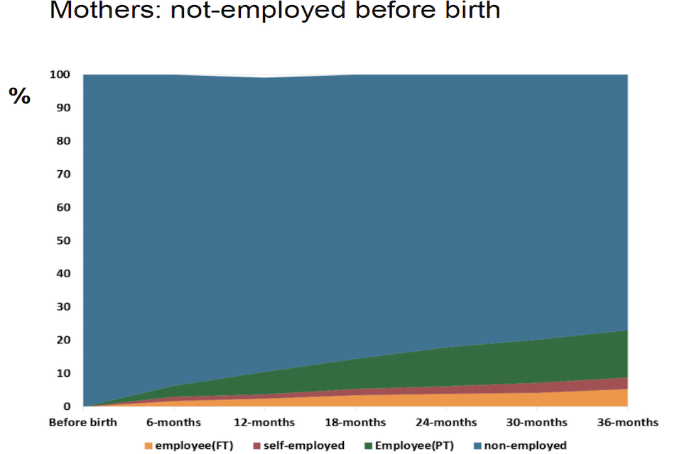 30% of new mothers, and 20% of first time mothers, were not working in the year before birth. These women were very unlikely to return to work subsequently, with fewer than 1 in 4 returning to work in the subsequent 3- to 5-years. These women who are persistently outside the labour force are typically younger, less educated and more likely to be single than those holding a job prior to childbirth.