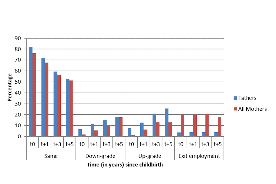 The report shows that occupational change is a gradual process which takes place 3 to 5 years after birth. Women almost always return to a job with the same occupational status as the one they left. Over time, it is not occupational downgrading, but rather a reduction in the probability of upgrading, which reduces the likelihood of mothers progressing at work.