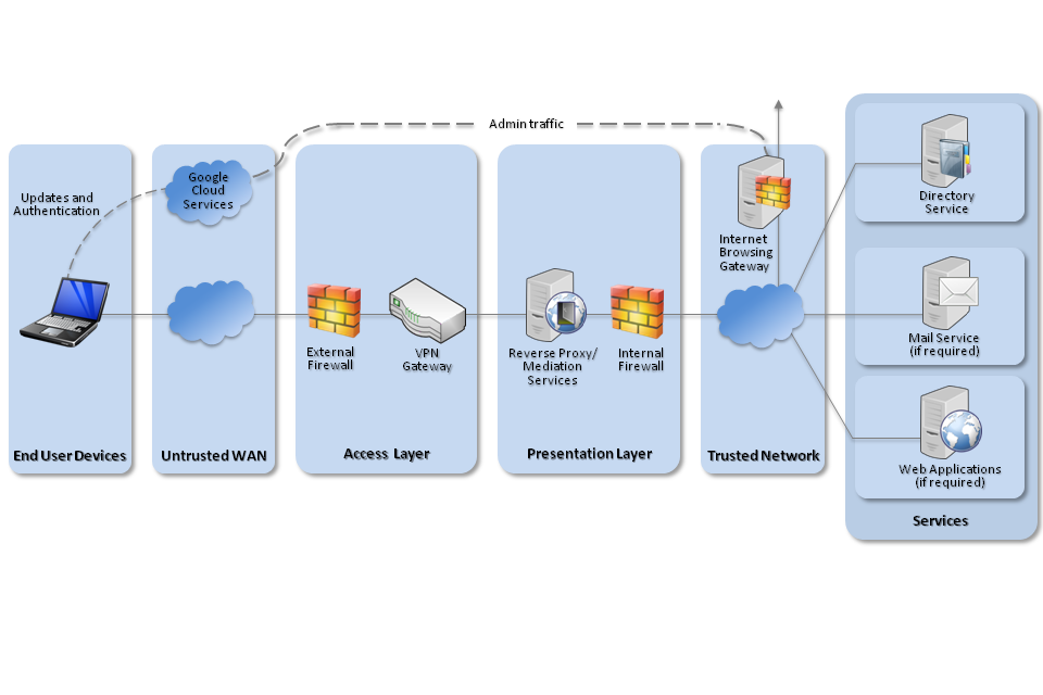 All remote or mobile working scenarios should use a typical remote access architecture based on the Walled Garden Architectural Pattern. The following network diagram describes the recommended architecture for this platform.