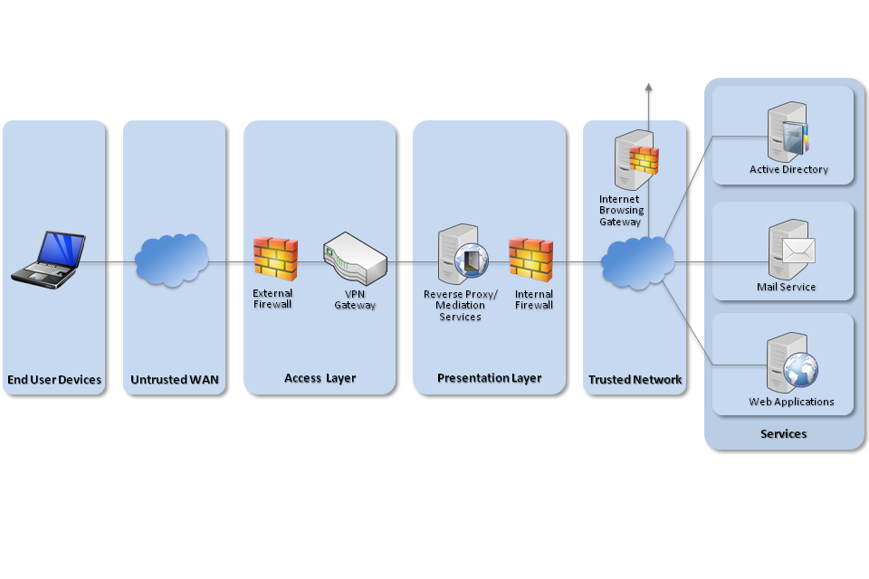 All remote or mobile working scenarios should use a typical remote access architecture based on the Walled Garden Architectural Pattern. The following network diagram describes the recommended architecture for this platform.