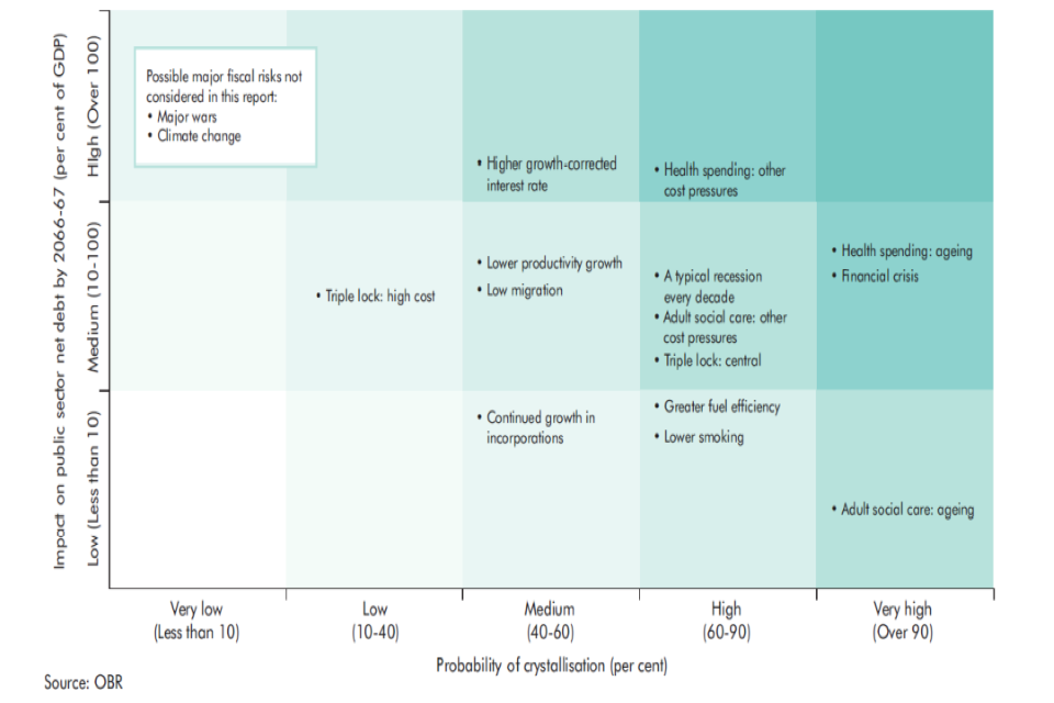 In its first Fiscal Risks Report (FRR) in 2017 the OBR identified 57 fiscal risks. Examples include the risk of future financial crises, increasing demand for health and social care, and changing tax revenues. The chart below summarises the subset of risks OBR identified as the main threats to long term fiscal sustainability.