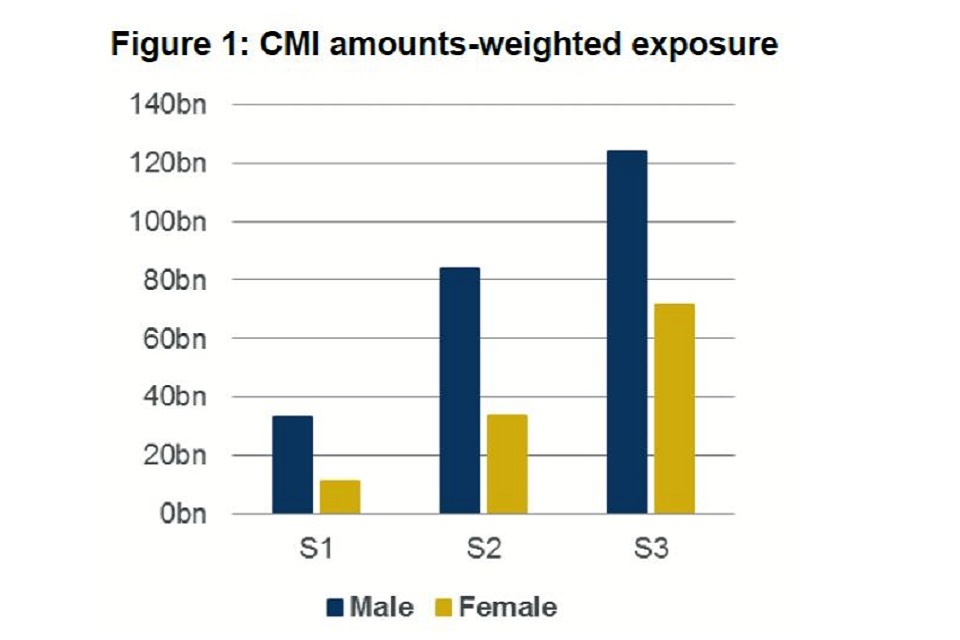 The additional data submitted by GAD has notably increased the amount of data used to prepare the S3 tables compared to the existing S1 and S2 tables. The chart above compares the amounts-weighted exposures each table is derived from, broadly the amounts of pension paid to members of the schemes included.
