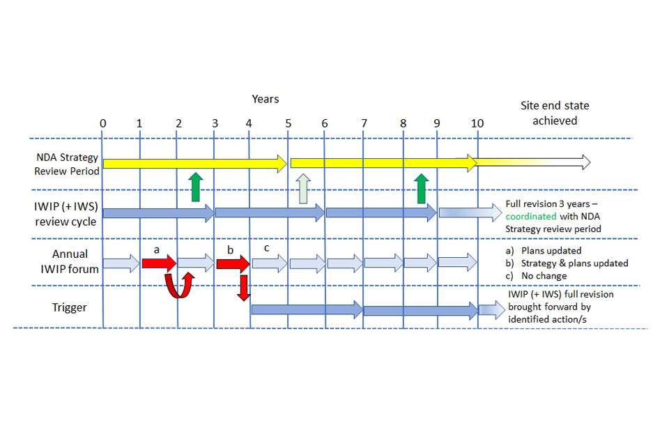 The IWIP should set out a timescale for review and update. All aspects of the strategy and implementation planning should be revisited on appropriate timescales, including the key objectives. Under routine circumstances a three-year review and update cycle should be considered for an IWIP, although detailed aspects of the implementation plan are likely to be “live” (Figure 4: Review cycles/periods.). Aspects of the implementation plan are likely to be subject to more frequent, routine change consistent with the delivery focus and vulnerability to factors such as plant availability and outages. Strategic aspects are unlikely to change as frequently. The IWIP will be considered annually in a dedicated NDA forum and this may prompt a limited annual review and update. As a minimum, an update should align with the NDA Strategy production process (a five-year cycle) and enable appropriate dialogue.