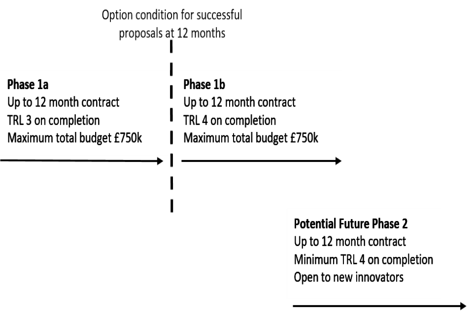 Your Phase 1a proposal can also include a further priced option for an additional 12 month period (Phase 1b), bringing the total contract length available to 24 months. This aims to allow you to advance the maturity of the technology to a minimum of TRL 4 after 24 months, with minimal interruption to the work. A Phase 1b Option Condition after the first 12 months will be included in any resultant Contracts awarded and the Authority will be under no obligation to exercise this option.