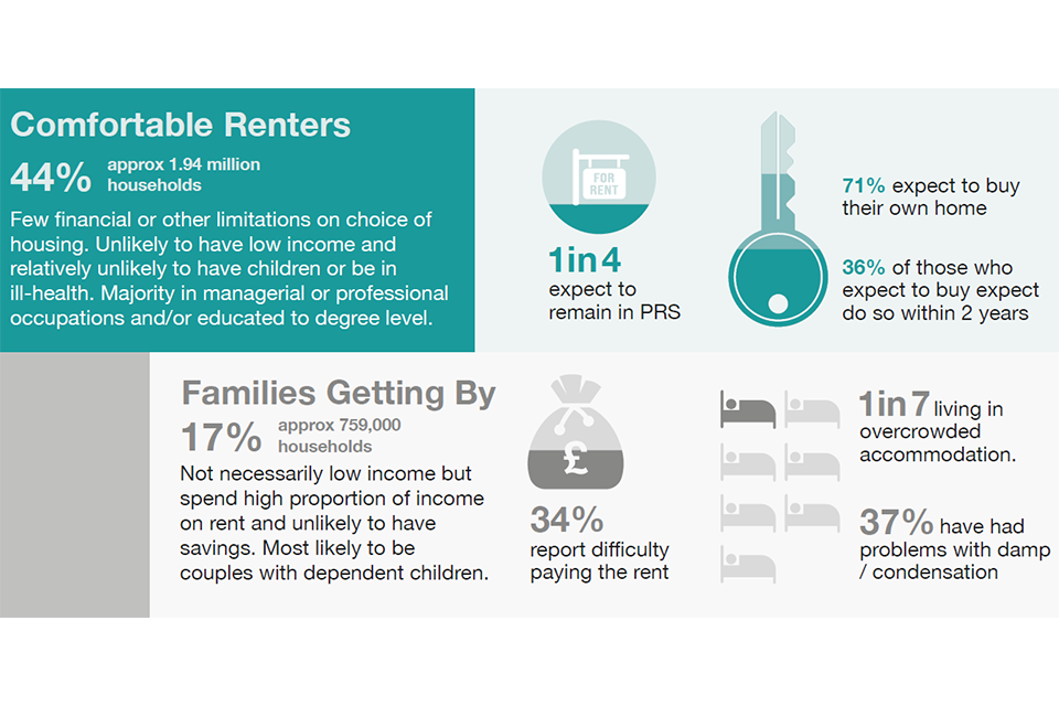 - Comfortable Renters are among the least likely to experience issues with their accommodation such as overcrowding (6%) or damp (33%) or to have difficulty paying the rent (16%). They are the most likely to expect to move out of the PRS by buying their own home, with many in this class (36%) expecting to do this within the next 2 years.