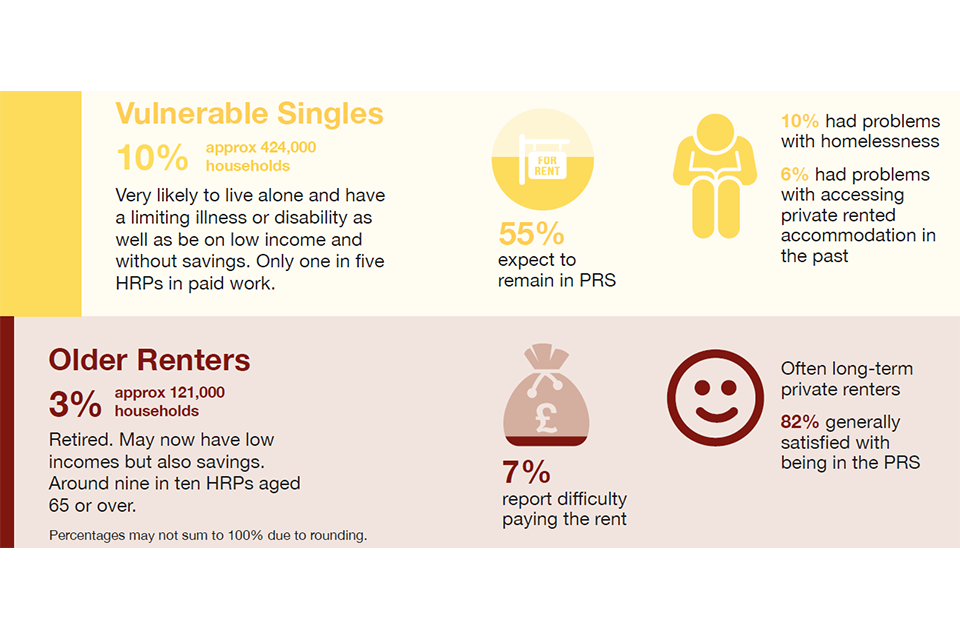 The analysis also identified a small class of Older Renters (3% of the PRS or approximately 121,000 households), most of whom are retired, who appear to have relatively little need for additional support with their tenure. Some of this class face issues with low income and/or poor health but they are among the most satisfied with their property and its state of repair and their current tenure. They tend to have been in both the PRS and their current accommodation for a relatively long time and expect to remain in the PRS.