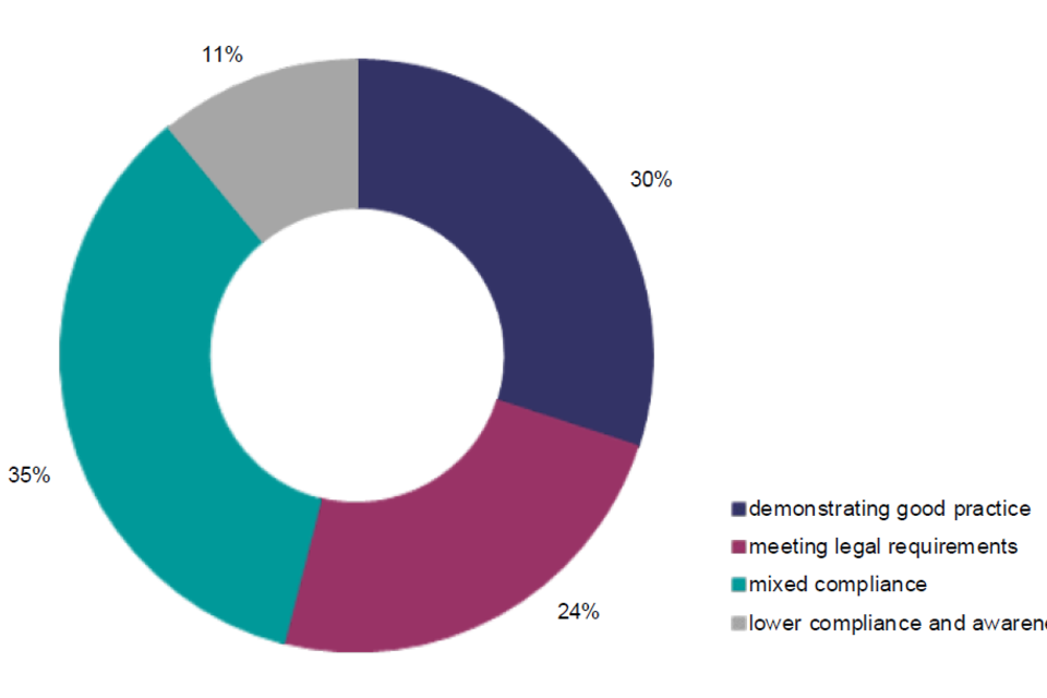 Two further groups have patterns of compliance that suggests more limited awareness with or engagement with legislation and good practice. We call these groups: ‘mixed compliance’ and those with ‘lower compliance and awareness’.