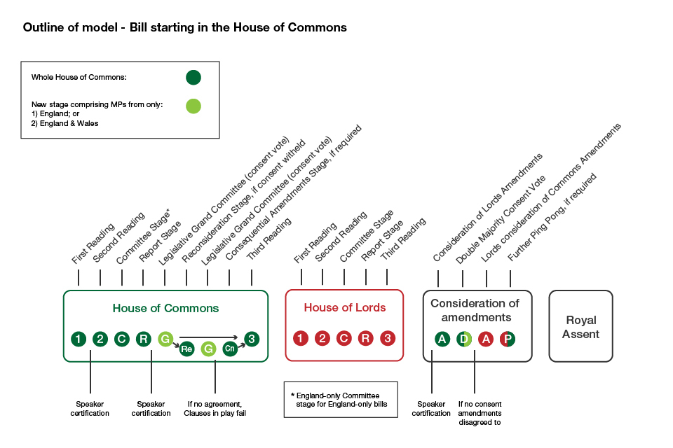 The government has announced plans to change the way legislation is considered in the House of Commons to give English and Welsh MPs a fairer say over laws that only affect their constituencies and are on matters which have been devolved. This note sets out how the new legislative process will work if it is agreed by the House of Commons. It is published alongside the proposed new Standing Orders and an Explanatory Memorandum.