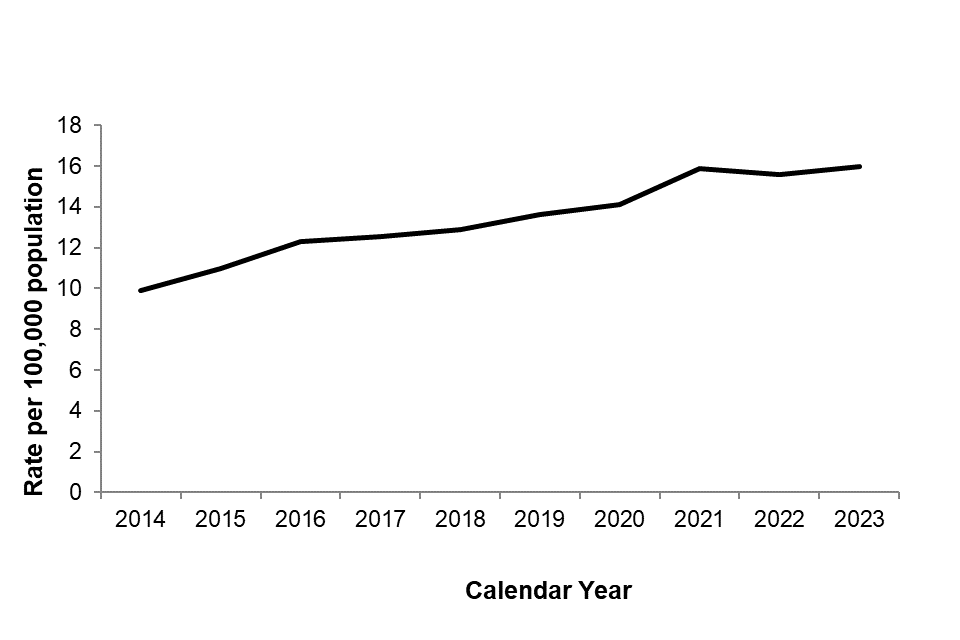 Figure 1. Rate of Enterococcus spp. bacteraemia per 100,000 population in England: 2014 to 2023