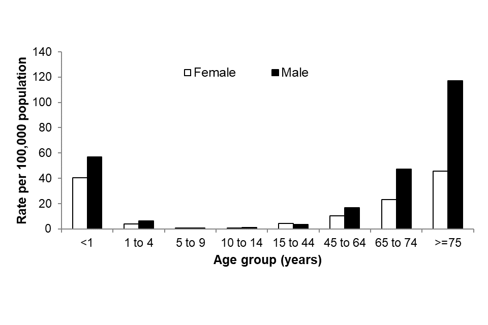 In 2023, as seen in previous years (6), the highest overall rate of bacteraemia caused by enterococci was in persons 75 years old and over (76.6 per 100,000 population). This was followed by under 1 year olds (51.1 cases per 100,000 population). In the rest of the paediatric population, the overall rate of Enterococcus spp. bacteraemia in the 1 to 4 year, 5 to 9 year and 10 to 14 year age groups was 5.1, 0.9 and 0.9 per 100,000 population, respectively (Figure 3). For more information on paediatric bloodstream infections, please refer to the Health Protection Report: Laboratory surveillance of paediatric bacterial bloodstream infections and antimicrobial resistance in England: 2018 to 2022 (6).