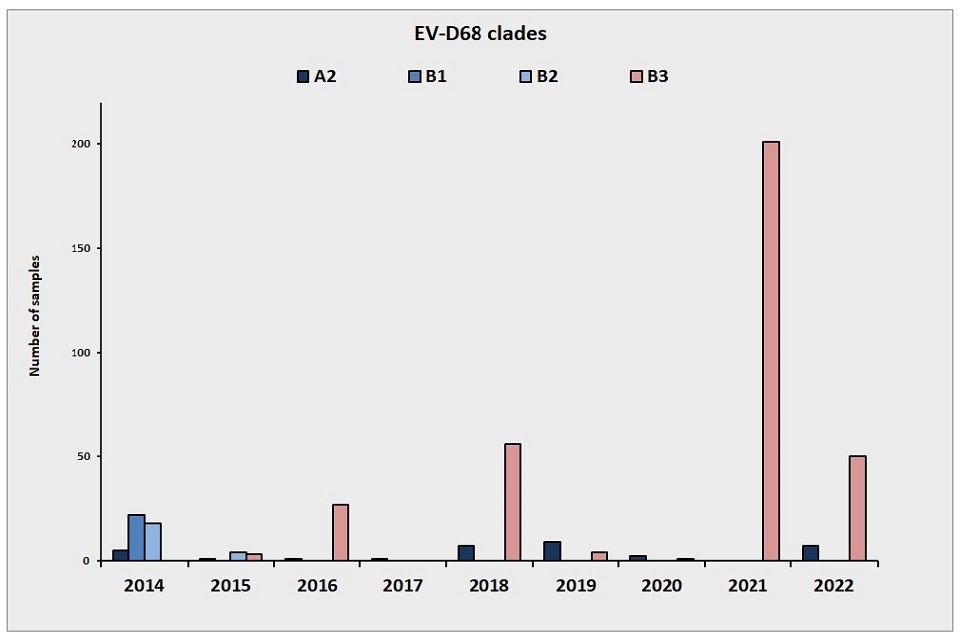Figure 3. EV-D68 clades identified by year since 2014. Number of samples by clade is represented by coloured columns. Total number of enterovirus samples is represented by a line