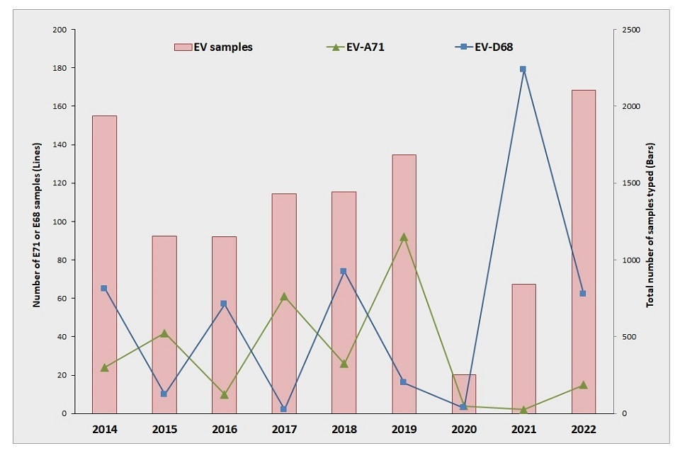 Figure 2. Number of samples identified as enterovirus EV-A71 and EV-D68 types since 2014 represented by coloured lines. Columns represent total number of enterovirus samples by year (secondary axis).