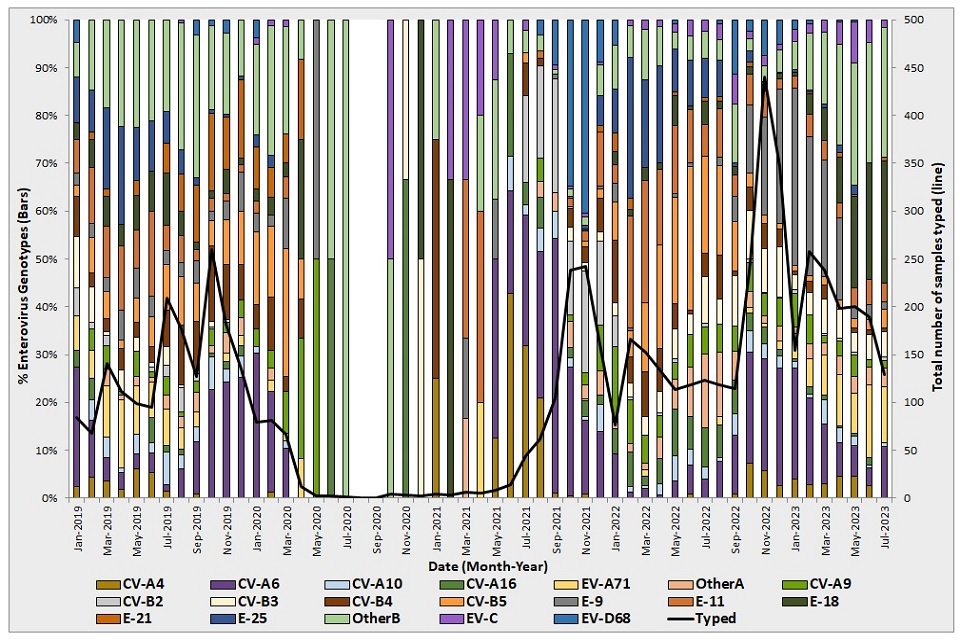 Figure 1. Non-polio enterovirus types identified by month since 2019. Stacked columns represent the contribution of individual or grouped enterovirus types. Total number of samples is represented by a line shown in a secondary axis.