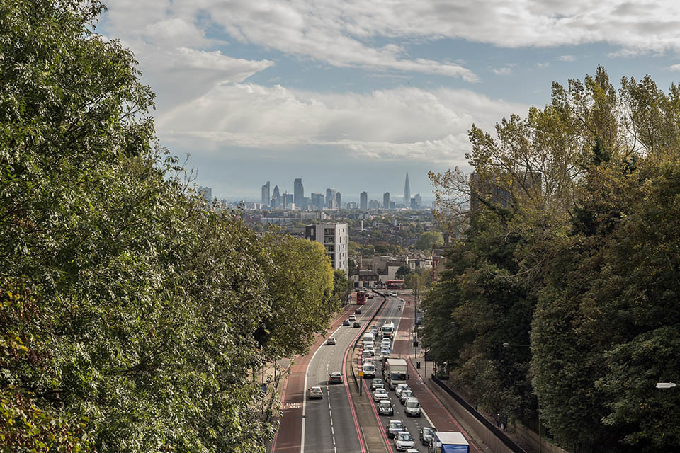 Street in London with queue of cars