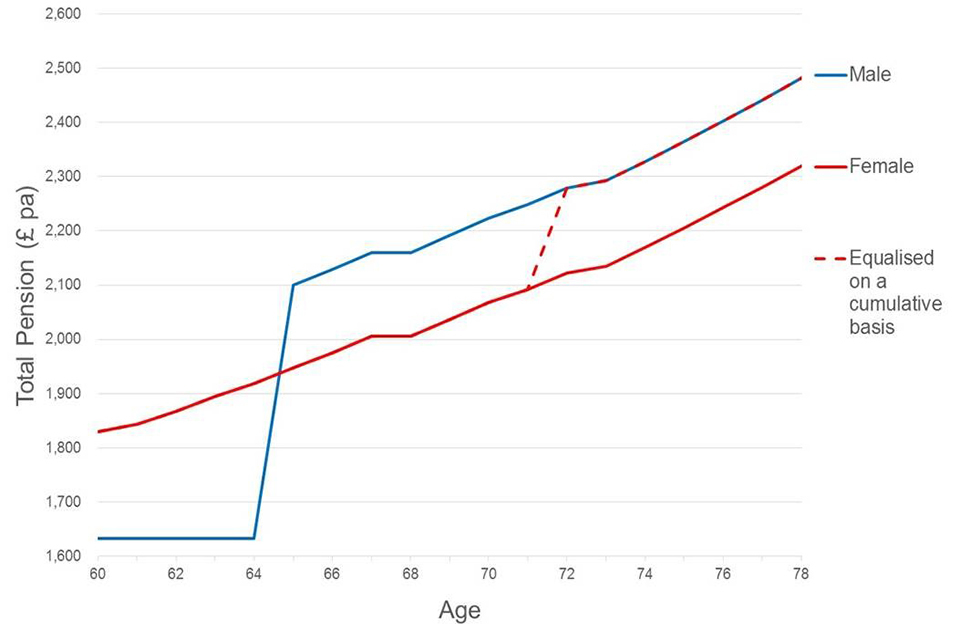 From this point (age 72 in this example), the cumulative pension paid to the man will become greater than that paid to the woman. When that happens, the woman will start to suffer discrimination on this measure.