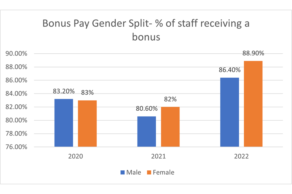 In analysing the Insolvency Service 2022 report, the mean Gender Pay Gap marginally reduced and whilst the median increased reflecting a shift in overall employee numbers. Whilst we accept the median has increased this may have been impacted by the pay freeze whilst continuing to recruit. In terms of the data relating to bonuses, women were higher than men in both the mean and median bonus paid so the overall figures are negative.