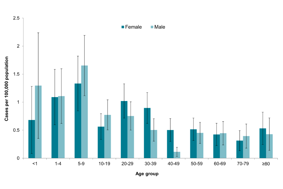 Of 365 confirmed STEC O157 cases in England, 195 (53%) were female. In 2020, children aged 5 to 9 years had the highest incidence of infection (1.50 per 100,000 population, CI 1.21 to 1.96), unlike in previous years where the highest incidence was in children aged 1 to 4 years.