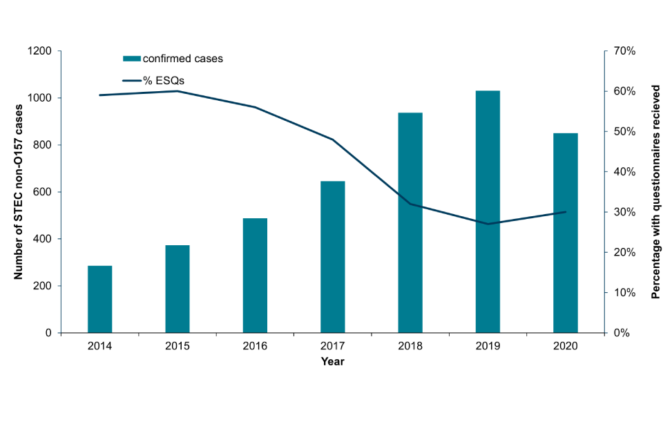 Since 2017, there has been decline in the number of ESQs received for STEC non-O157 cases, with a 35% reduction in the number of ESQs received from 2017 to 2020 (46% in 2017, 33% in 2018, 27% in 2019 and 30% in 2020), which may be associated with increasing numbers necessitating prioritisation and the implementation of algorithms in the 2018 guidance, which was subsequently updated in 2023.