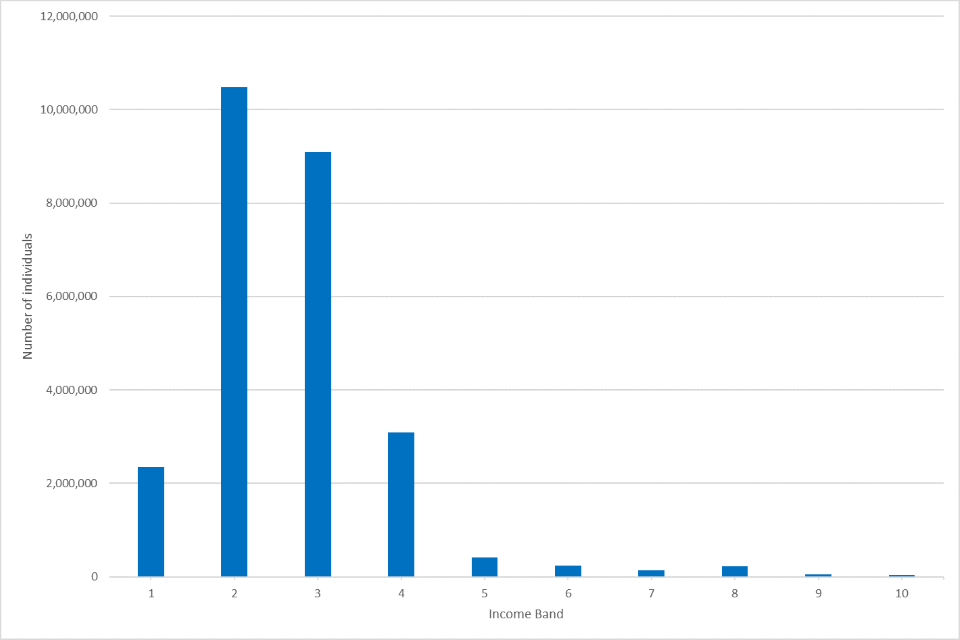 - Taxpayers were grouped into ten income bands for our analysis - they align with the five-band system, whilst also accounting for the Taper rate (where an individual earning more than £100,000 is subject to a higher marginal tax rate due to the removal of their Personal Allowance)