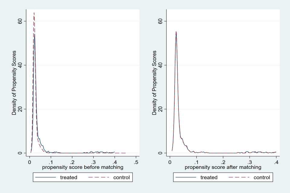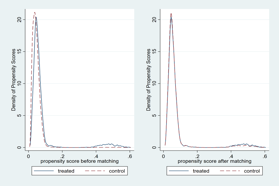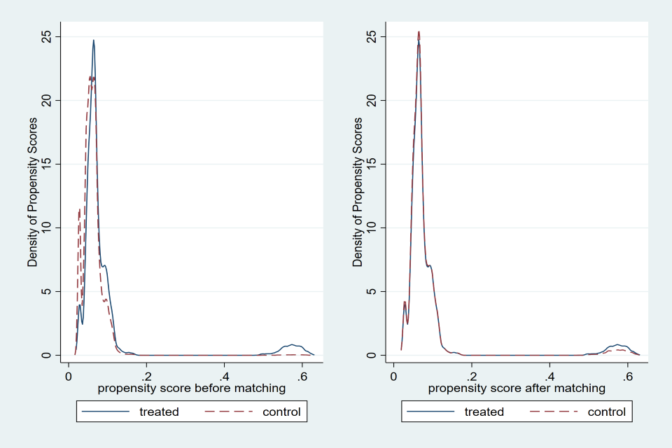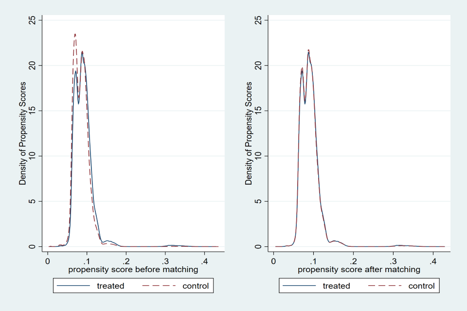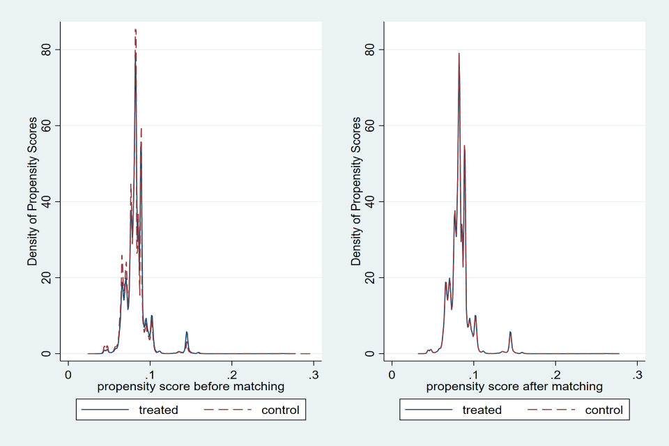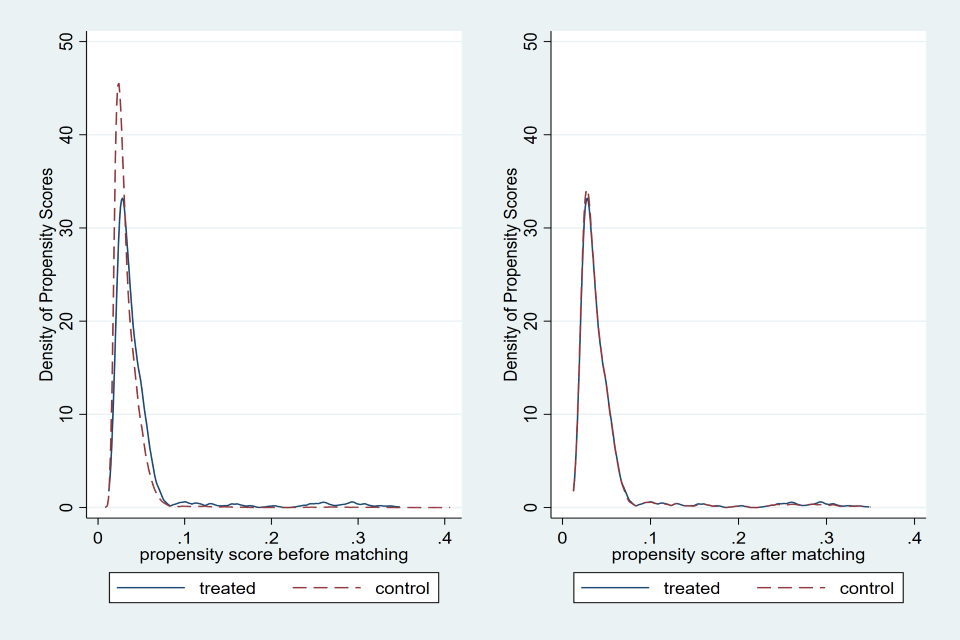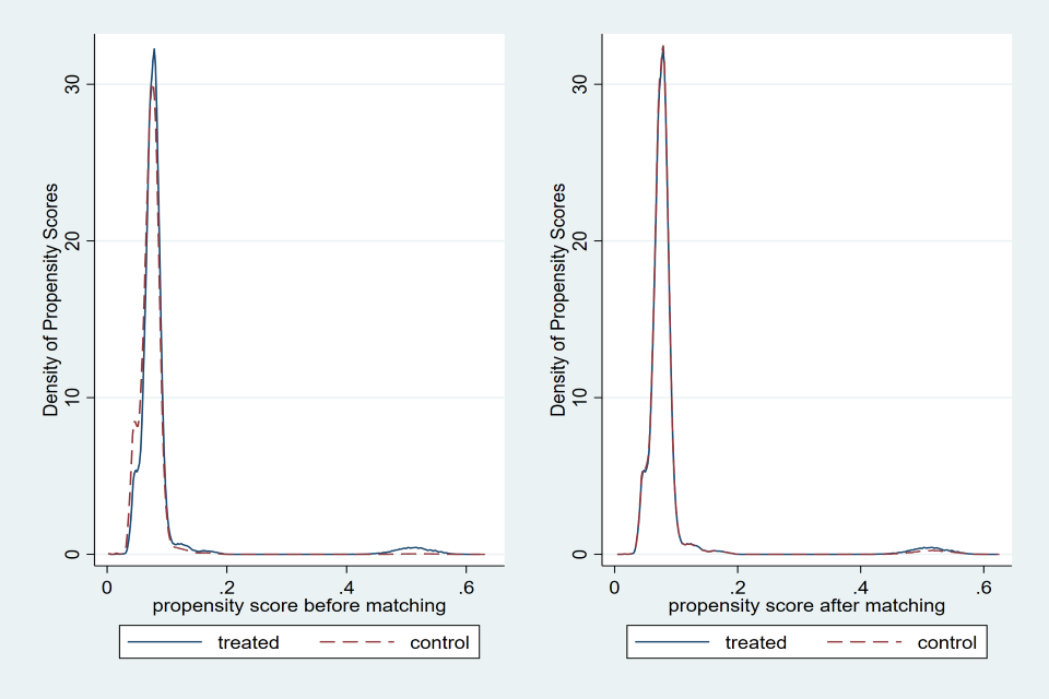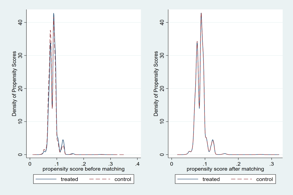 The figures below show the propensity scores before and after matching for each income band with nearest neighbour one-to-one matching. On the left, the graph shows the density of propensity scores for the treated and control groups before matching, where we generally see that there are sizeable differences in the density of propensity scores. On the right we see significant overlap between the treated and matched control groups.