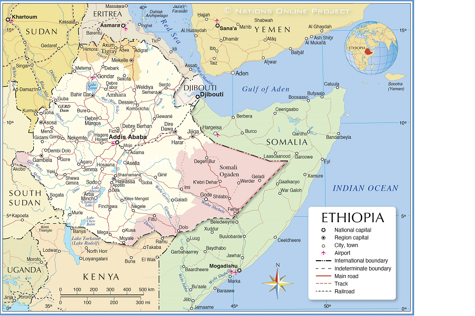 3.1.7 Nationsonline.org has provided below map of Ethiopia showing neighbouring countries, major cities and transport links[footnote 7]