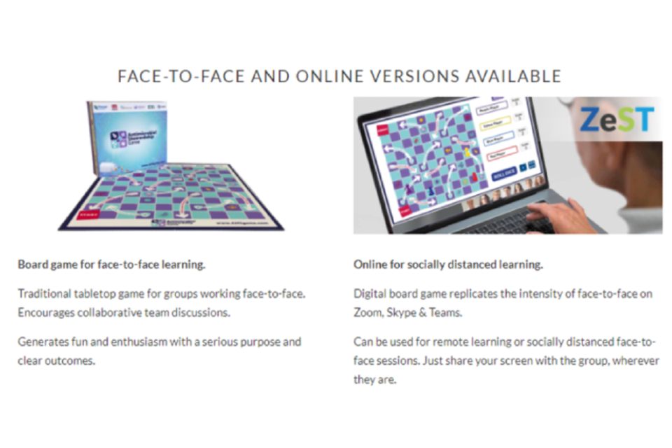 Figure 12. is split into 2 images. The image on the left shows a physical version of the boardgame, which sits in front of its box. On the right, there is an image of an individual using a laptop, with an online version of the game on the screen. In both images, the game takes the form of a 10 by 10 grid board, with alternating blue and purple squares.