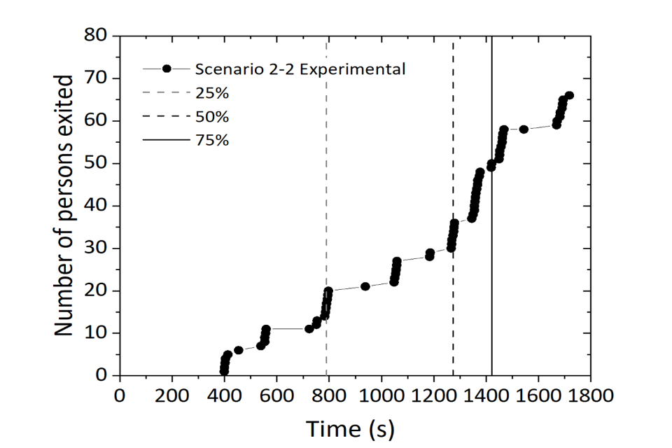 Figure 12 shows that the simulated results were close to the experimental evacuation times in all stages of the evacuation. Also, the total evacuation time predicted for Test 2-2 was 28 minutes 43 seconds (1,723 seconds), compared with 28 minutes 38 seconds (1,718 seconds) during the experiments. This resulted in a very low error of 0.29%. The first person evacuating the buildings was relatively accurately predicted, as they were shown to exit the building approximately 30 seconds later than the test data.