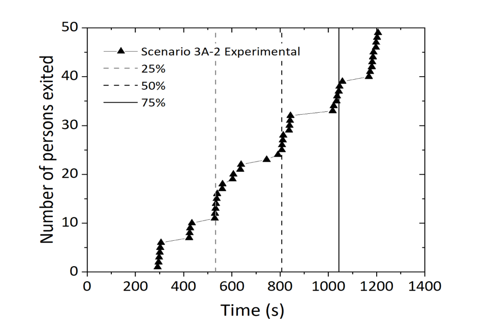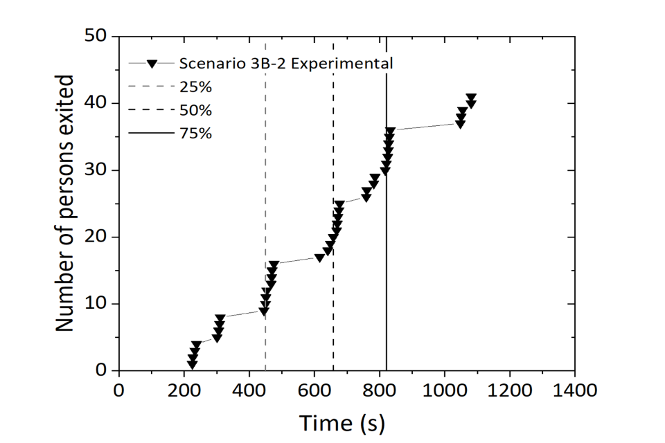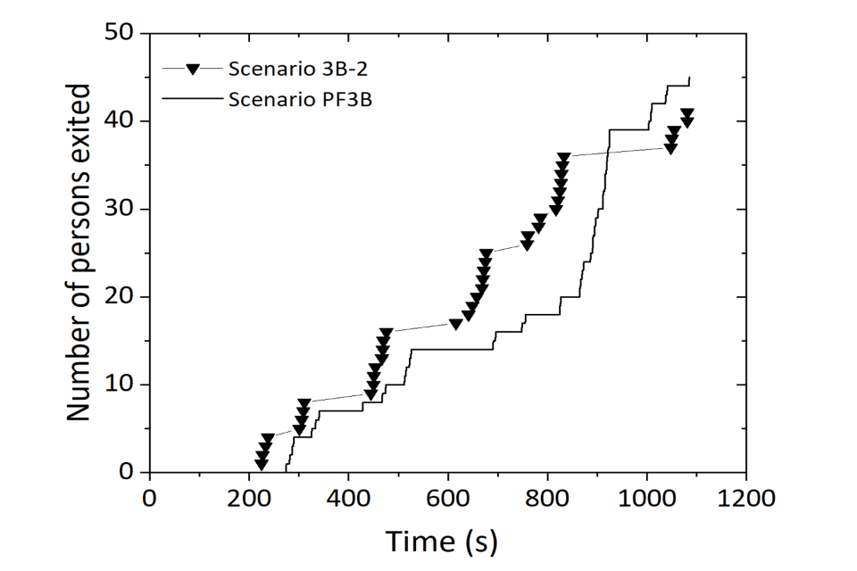 Figure 14 shows that the simulated results were close to the experimental evacuation times in all stages of the evacuation. The total evacuation time predicted for Test 3B-2 was 18 minutes 5 seconds (1,085 seconds), compared to 18 minutes 1 second (1,081 seconds) during the experiments. This resulted in an error of 0.37%. The first person evacuating the buildings was relatively accurately predicted as they were shown to exit the building approximately 60 seconds later than the experimental data.