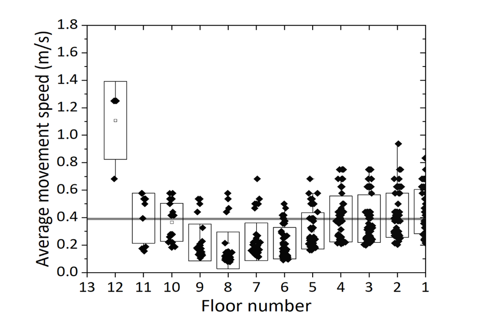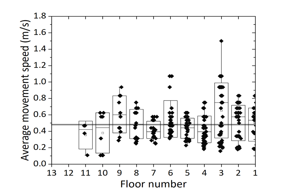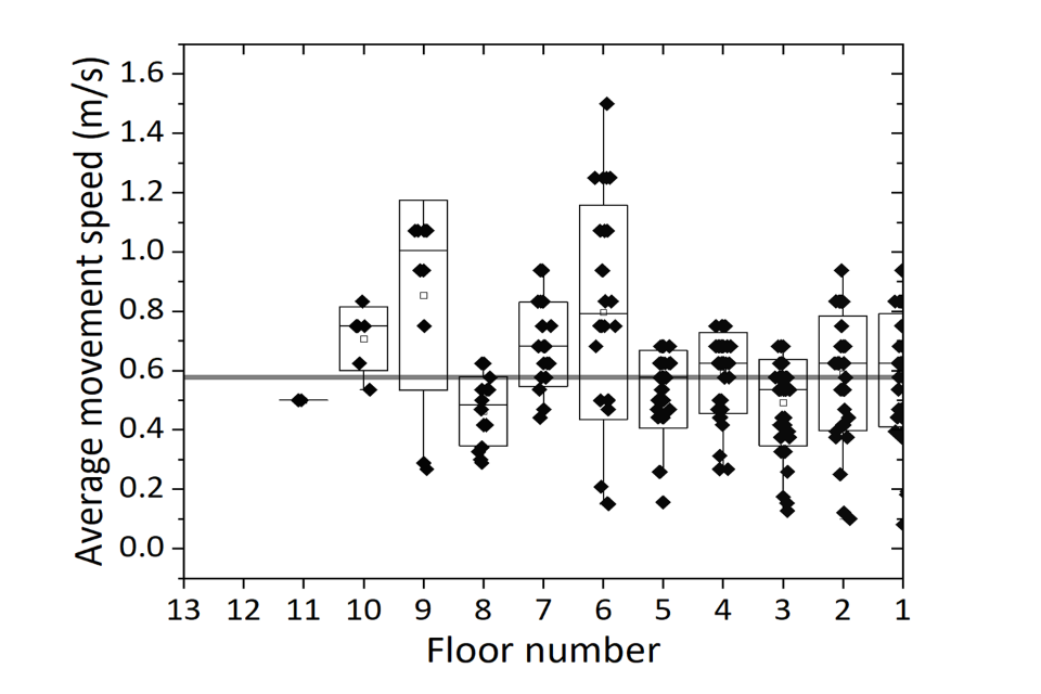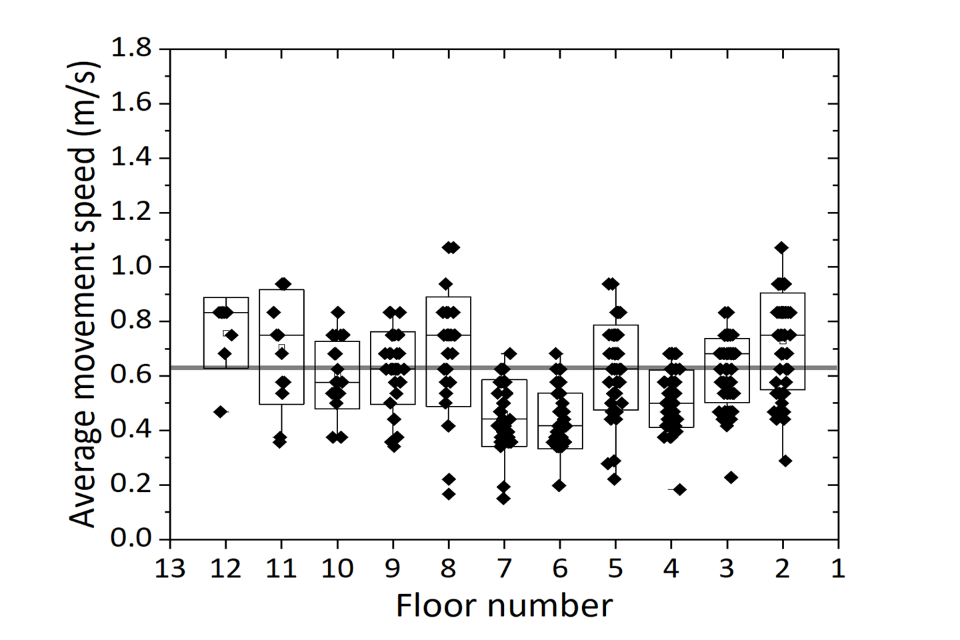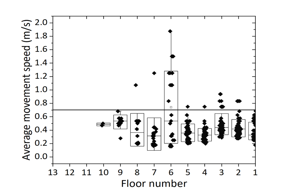 Local movement speed varied by floor. Faster speeds were generally recorded at lower floors, with slower speeds at the top and in the middle floors of the building, close to the fire, where obstacles and congestions were more likely to be present.