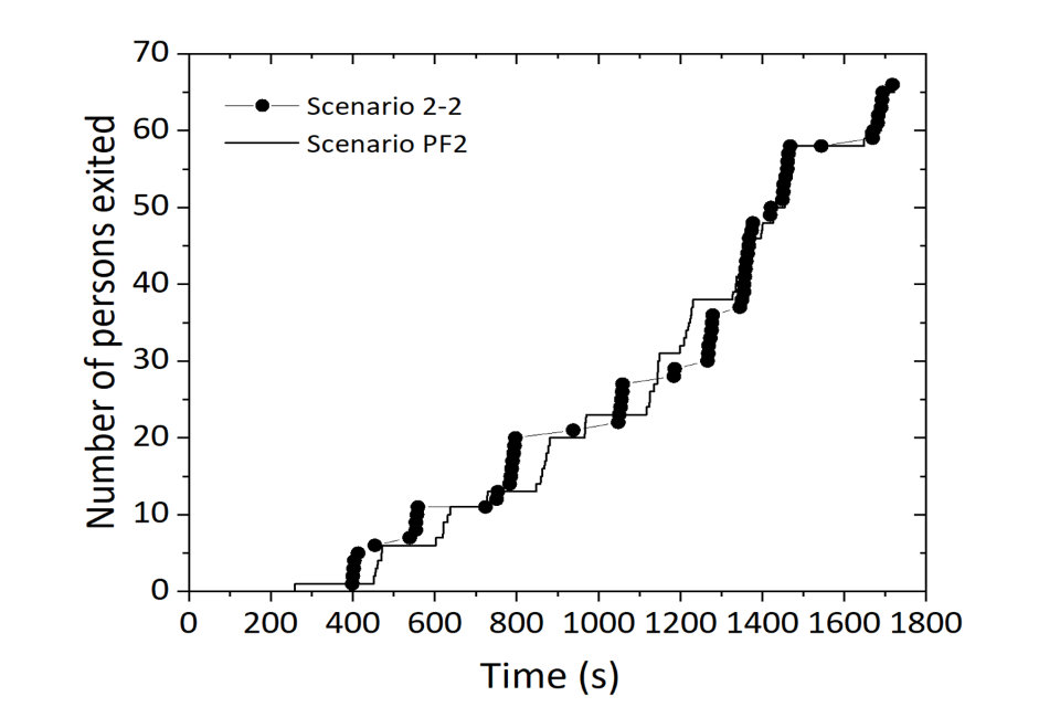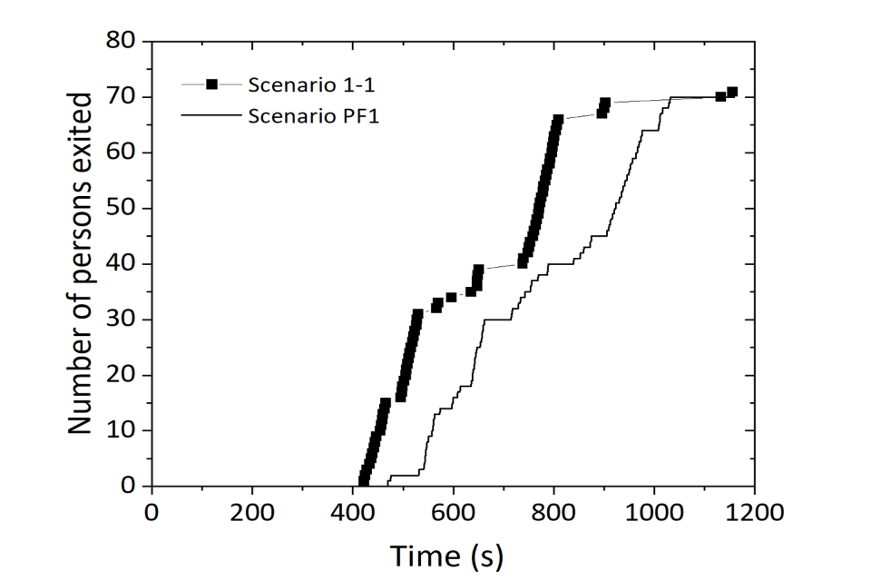 Numerical data on the building exit curves and how the model compares with the live operational test data are presented in figure 11 for Test 1-1, figure 12 for Test 2-2, figure 13 for Test 3A-2, figure 14 for Test 3B-2 and figure 15 for Test 4-2. The following 5 figures use labels, such as ‘Scenario 1-1’, which refers to the experimental activity Test 1-1, and ‘PF1’, which refers to the Pathfinder modelling applied to the corresponding strategy.
