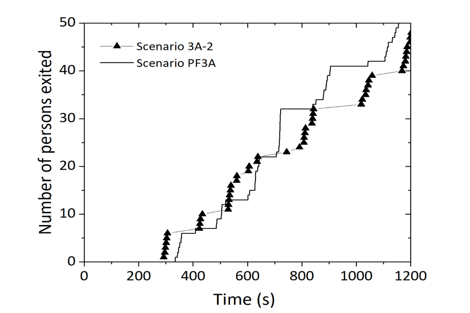 Figure 13 shows that the simulated results were close to the test evacuation 3A-2. The total evacuation time predicted for Test 3A-2 was 19 minutes 19 seconds (1,159 seconds), compared to 20 minutes 6 seconds (1,206 seconds) during the experiments. This resulted in an error of -4.06%. In this case, the first person evacuating the buildings was relatively accurately predicted as they were shown to exit the building approximately 50 seconds later than the test data.