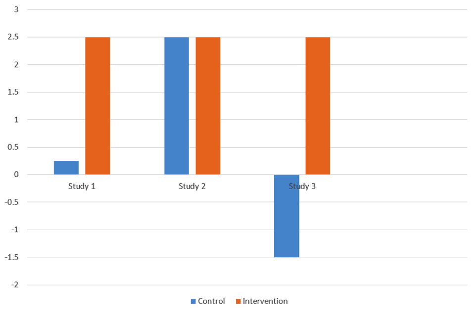 The graph illustrates hypothetical findings from 3 outcome evaluations. The first study shows an intervention group doing much better than the control group who show a small improvement, so the intervention may have had a real effect. In the second study the intervention group changes by the same amount but, because the control group also changes by this amount, it appears that the intervention was ineffective. In the third study the same change in the intervention group is contrasted with a deterioration in the control group, suggesting that the intervention may have prevented naturally occurring deterioration and well as prompting improvement.