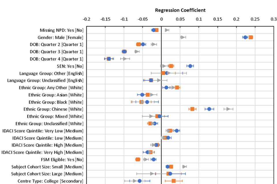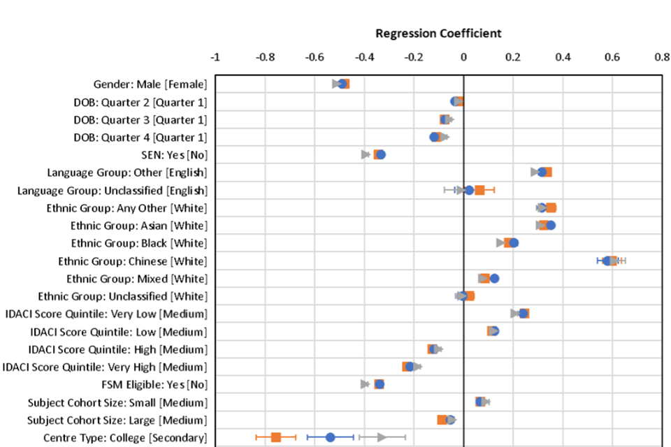 It is worth acknowledging upfront that any relationships identified through the following analysis cannot be said to be causative of grading differences. In this type of study, it is important to acknowledge that some of the relationships may be simple correlations and there may be other unmeasured causative factors involved, which were not available to the analyses, that may have had an influence on results. Also, due to the nature of the very large datasets used here, even very small differences between groups may be ‘statistically significant’, when in reality the effect on grades due to these differences may have very little real-world impact. Only where factors have a significant relationship with grades and the size of that effect is meaningful in one or more years, are changes in those relationships likely to be meaningful. Therefore, throughout we will attempt to put results into context by defining notable levels of change in the relationships between variables and candidates’ grades. However, we also acknowledge that even small effects may have an impact on some individuals.