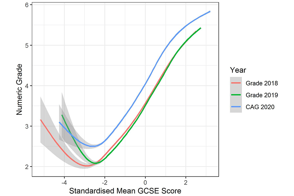 Results about candidate level features reflected those already published from an analysis of the equalities impact of grading in 2020 by Ofqual (Lee et al., 2020). The most notable effect was a decrease in the attainment gap between male and female students at A level. Whereas previously boys have somewhat outperformed girls, this effect was slightly reduced in 2020. This may represent a genuine closing of the attainment gap, following a trend from previous years, although it could represent a small bias in favour of girls in A level CAGs. In a qualitative study by Ofqual (Holmes et al., 2021) teachers suggested that in preparation for exams boys are more likely to show a ‘last minute push’ and this was difficult to legitimately factor in to CAGs.