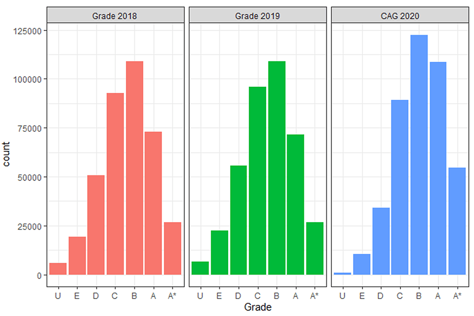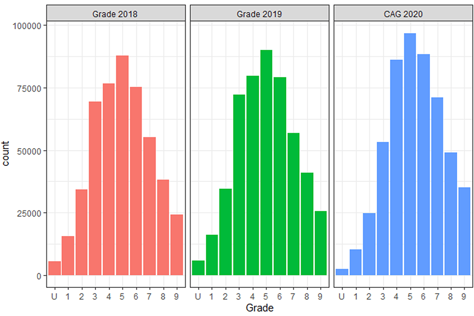 In summer 2020, exams for GCSEs and A levels, among other qualifications, in England were cancelled as part of the government’s response to the coronavirus (COVID-19) pandemic. The decision to cancel exams was announced in March 2020. To continue to be able to award grades and ensure the ability of candidates to progress, centres were asked to submit to exam boards’ judgements of the grades they believed candidates would have been most likely to achieve if exams had gone ahead. Centres were asked to provide a grade for each candidate in each subject taken. These grades were referred to as Centre Assessment Grades (CAGs).