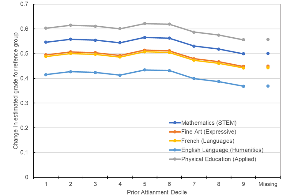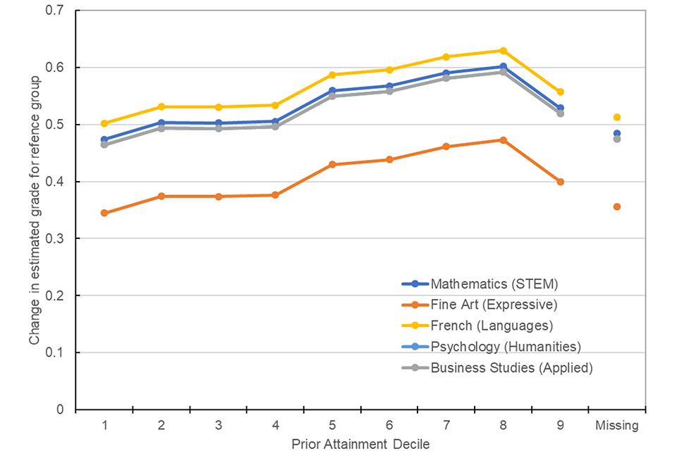 Due to the increase in mean grade, there was some evidence that at the top of the grade distribution there was a plateauing of the relationship with prior attainment. Effectively in 2020 candidates with the highest prior attainment received on average slightly smaller increases in grades compared to previous years as they were already attaining the highest grades possible. This was reflected at centre level as schools and colleges which had lower previous performance and candidates with lower mean prior attainment were those with the largest increase in mean grades. Again, this was likely due to the fact that lower attaining schools had ‘greater headroom’ and therefore ‘further to travel’ up the grade range, whereas the level of increase for higher performing schools was limited due to the ceiling effect of the top of the available grade range.