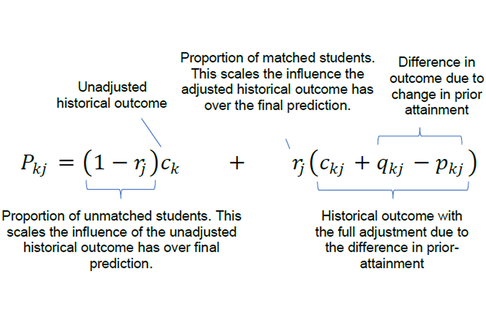 This equation is explained under 'Step 6: Determine the centre-level predicted grade distribution for summer 2020' in the document 'Awarding GCSE, AS, A level, advanced extension awards and extended project qualifications in summer 2020: interim report'.