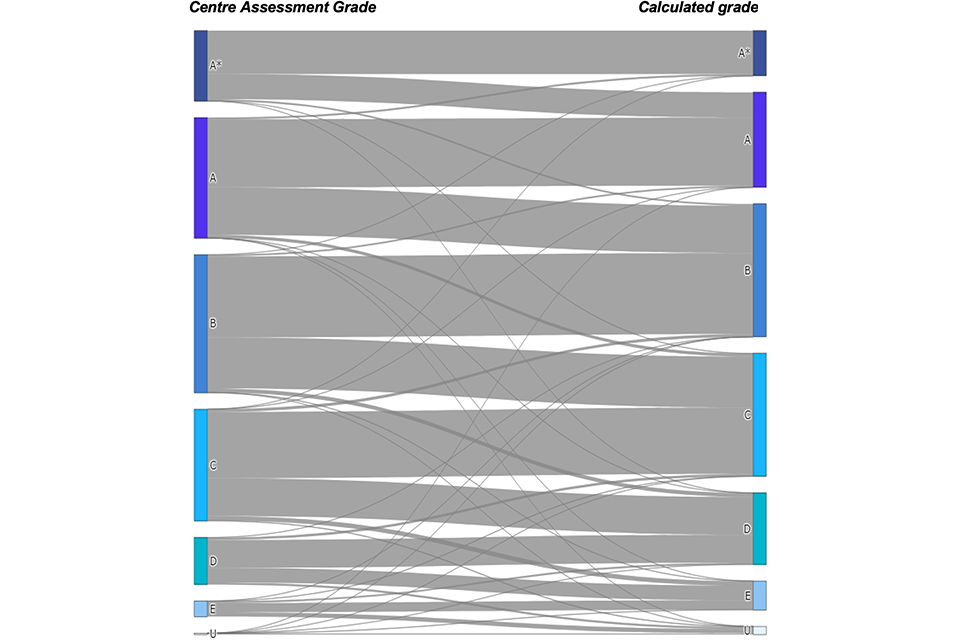 Sankey diagram showing the relationship between A level Centre Assessment Grades and calculated grades in summer 2020. Numbers underlying the diagram are shown in Table 1.