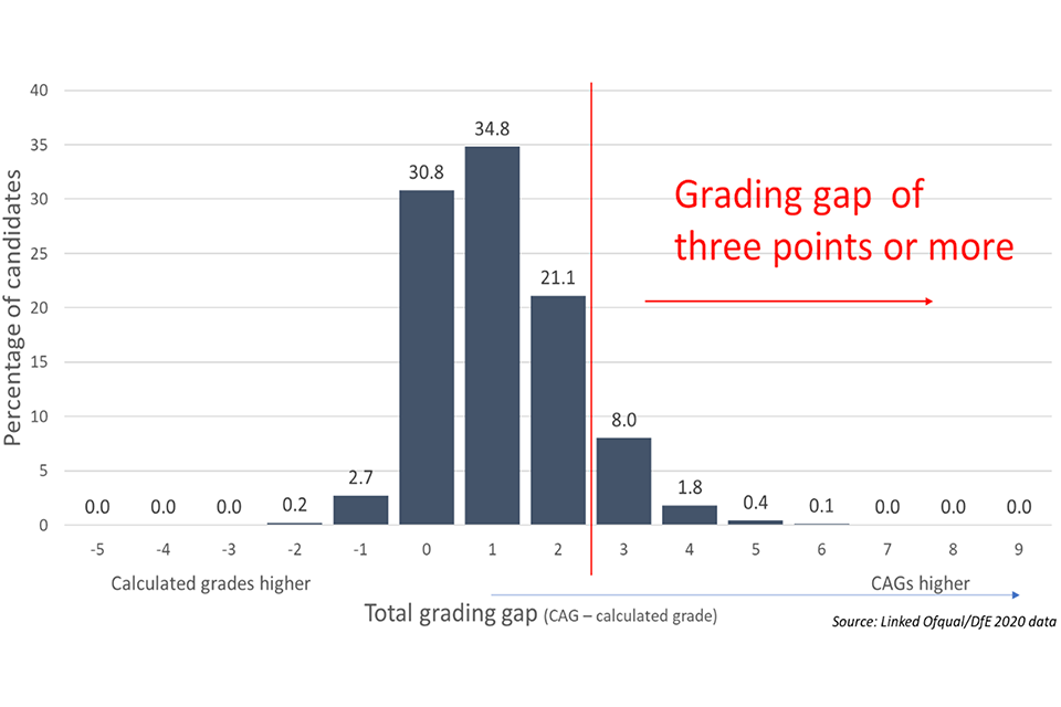 Although we are unable to identify those for whom the discrepancy between CAG and calculated grades caused greatest distress or had the greatest consequence, we can identify those for whom the discrepancy was largest. That is, we have added together the discrepancies – or gaps – between calculated grades and CAGs to calculate a ‘grading gap’ for each candidate. Consequently, a candidate given CAGs ABB who was given calculated grades ACD, would have a candidate-level grading gap of three grades – with the CAG higher than the calculated grades. The candidate-level distribution of grading gaps is shown in Figure 2.