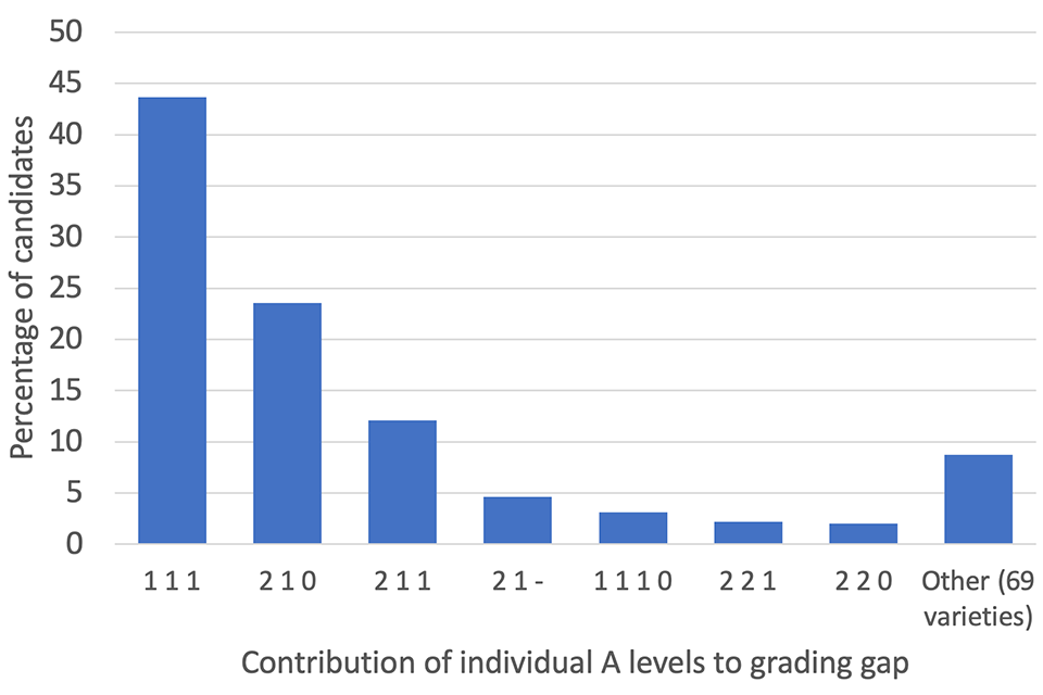 Figure 3. Candidates with a grading gap of three points or more, contribution of individual A levels to the grading gap