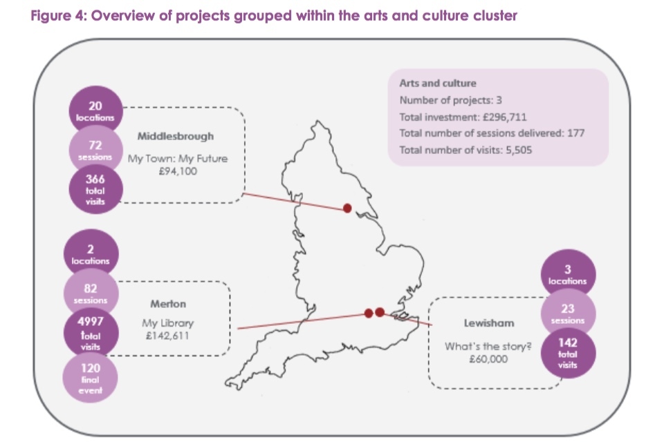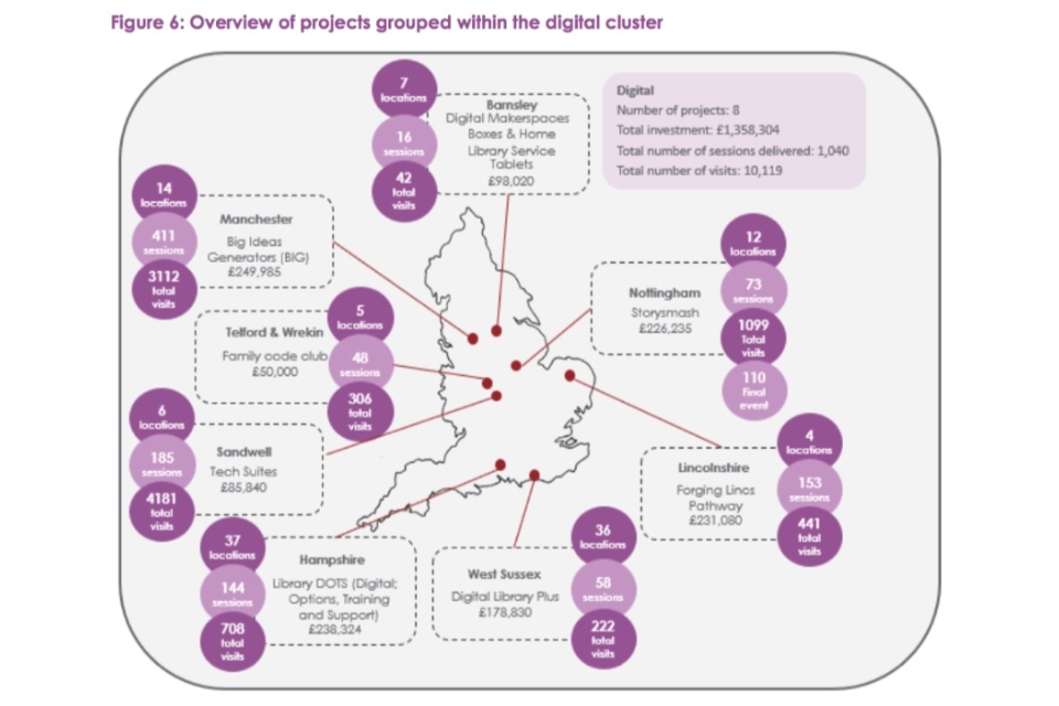 Managed by the Arts Council, the £3.9 million fund awarded grants of between £50,000 and £250,000 to 30 projects across 46 library services in March 2017. These were grouped into one of 5 thematic ‘clusters’ within the evaluation, bringing together projects focused on Libraries Deliver: Ambition outcome areas, aims or activities.