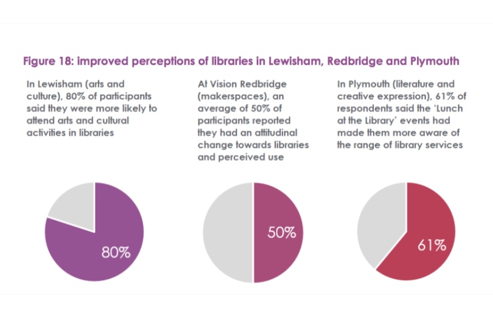 The available evidence suggests these developments also challenged and improved people’s perceptions of what their local library could offer and achieve. This was felt to have contributed to greater understanding and improved working relationships with local organisations and other council teams such as IT, public health, social services and policy departments, as well as increased service use.