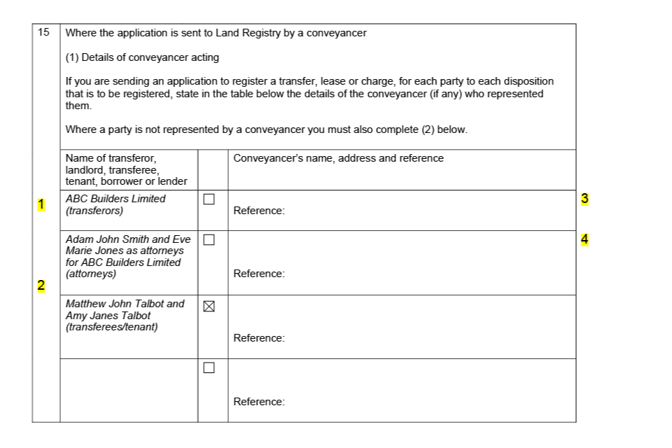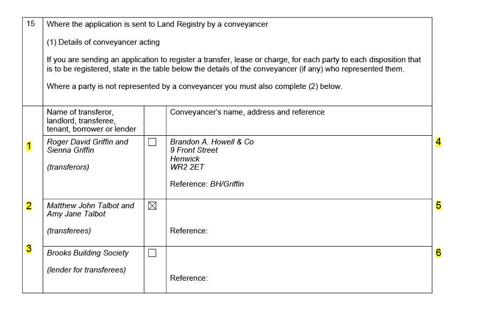 Rhaid i’r trawsgludwr sy’n cyflwyno’r cais restru’r holl bartïon i’r trosglwyddiadau, prydlesi neu arwystlon yng ngholofn un y tabl ym mhanel 15. Lle nad yw parti yn cael ei gynrychioli gan drawsgludwr, dylid llenwi adran (2) Tystiolaeth hunaniaeth hefyd. Os nad yw’r paneli perthnasol yn cael eu llenwi, caiff y cais ei wrthod.