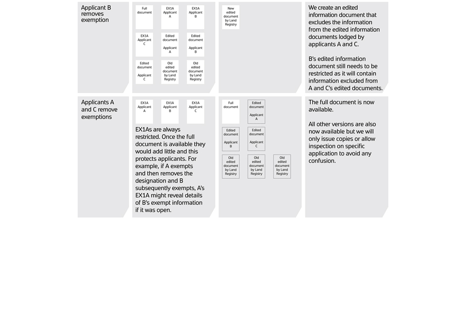 Where another party has also applied for exempt status but has not yet lodged an EX3, we will create a further edited information document. This will omit only that information that is omitted from any edited information documents that have not yet been withdrawn. Where there has only been one application for designation as an exempt information document, we will simply remove the designation.