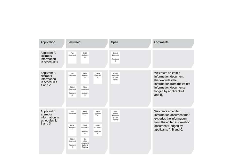 We will create a further edited information document excluding the information from all edited information documents that have been lodged. This is the edited information document that will then be generally available. The edited information documents lodged with each separate application will be retained by us but will not be subject to the general right of inspection under the Land Registration Act 2002.