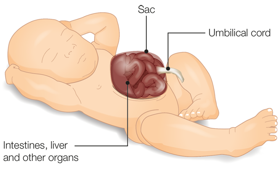 Illustration of baby with exomphalos showing intestines, liver and other organs developed outside the abdomen