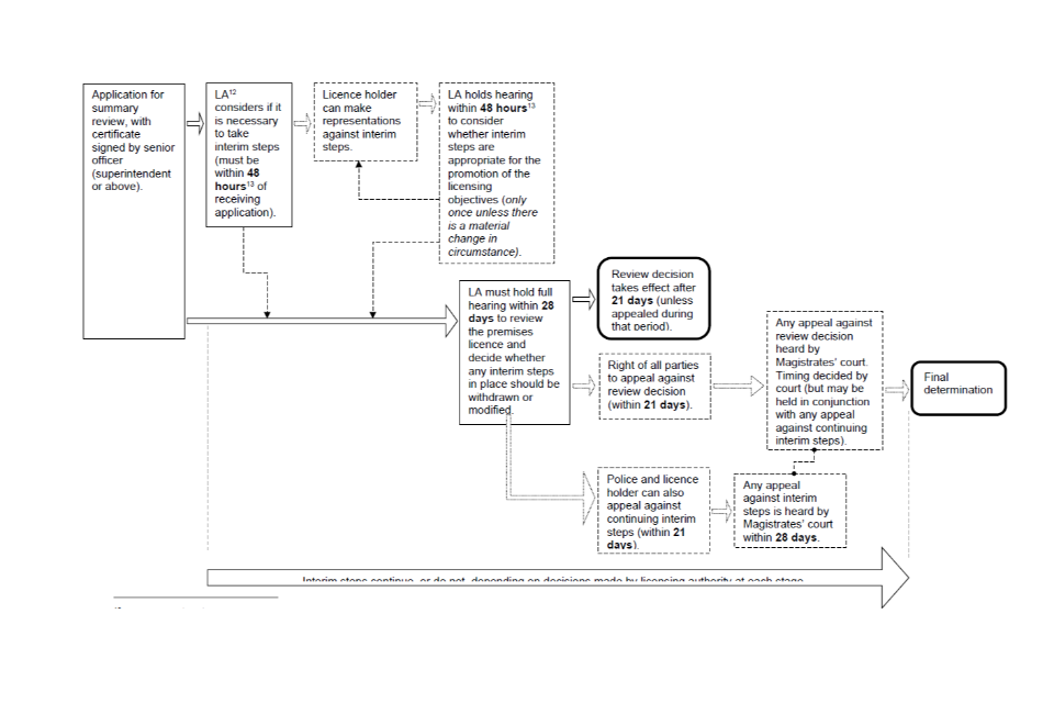 This means that, for example, if the application was received at 3pm on a Friday, the 48 hour period would cover the remaining 9 hours on that Friday and the remaining 39 hours starting on the Monday morning (provided it was not a bank holiday). In this case the licensing authority would have to decide on interim steps by 3pm on the Tuesday. ↩