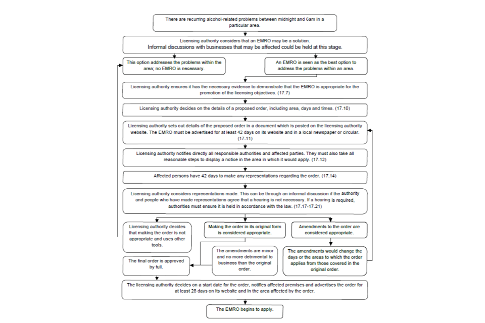 - Licensing authority sets out details of the proposed order in a document which is posted on the licensing authority website. The EMRO must be advertised for at least 42 days on its website and in a local newspaper or circular. (17.11)