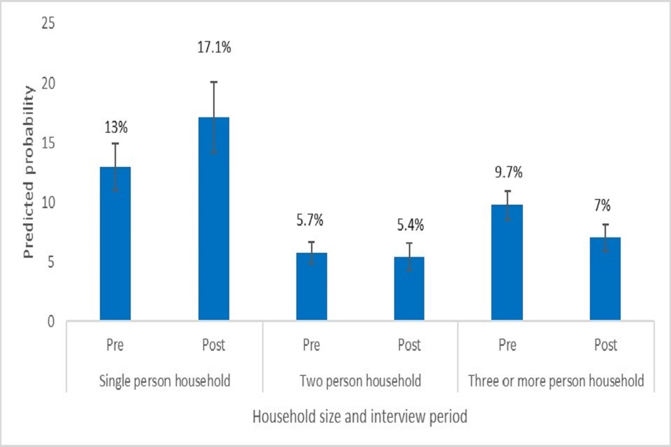To explore this further, we added a pandemic-household interaction to the model outlined above. As odds ratios for interaction effects are crude and complex to interpret, we used predicted probabilities to report the results of this interaction and demonstrate how loneliness differed across different household sizes before and during the pandemic. Figure 1 illustrates the predicted probability of experiencing chronic loneliness, depending on household size before and after the start of the pandemic.